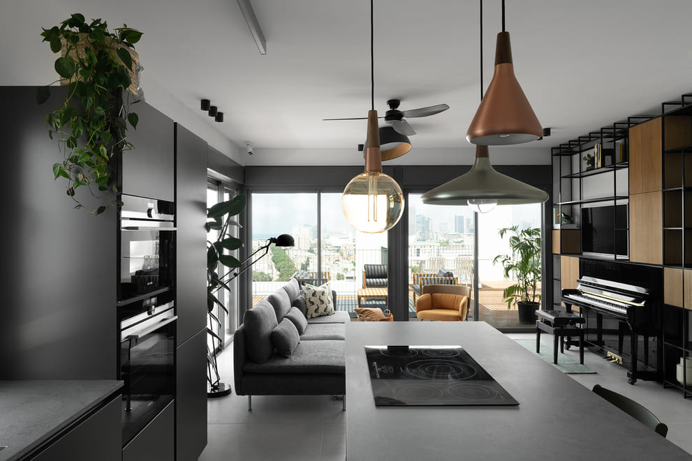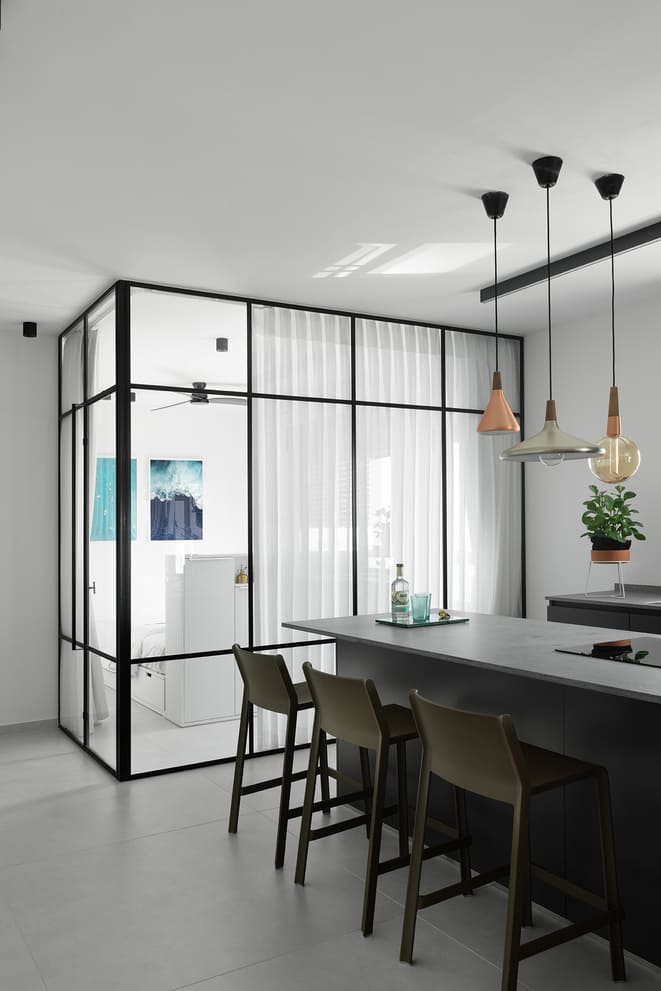 דירת הפנטהאוז, הינה בשטח של 90 מ"ר ולה עוד מרפסות בשטח כולל של 100 מ"ר. את החלל המרכזי חילקנו באופן כזה בו הסלון, המטבח, המרפסת והנוף אחד הם. את חדר השינה תכננו כקוביית זכוכית פתוחה לשאר החלל הציבורי וכך נהנה מפתיחות ואור מכל הכיוונים וכן רצף תכנוני, בו העין לא נחסמת במחיצות אטומות, וכך ניתן לחוות את הנוף הפנורמי שהדירה מציעה, מכל כיוון ובכל זמן. לצרכי פרטיות ובכדי ליצור ריכוך של האור החזק המגיע מכל החלונות סביב, הוספנו שתי שכבות וילונות, אטומים ודקורטיביים, ממש כמו בסוויטה מלונאית. לדירה עוד שני חדרי אורחים, ושני חדרי אמבטיה מאובזרים באופן מלא.