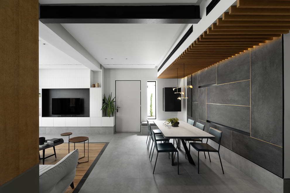 כיאה למשפחה שמארחת הרבה התבקשנו ליצור פינת אוכל גדולה ומכובדת, יצרנו קיר כח העשוי חיפוי גרניט פורצלן עם חלוקות סרגלי פליז ותאורה נסתרת משולבת כחלק מהקומפוזיציה השלמה. הן החומרית והן הקונספטואלית, להשלמת חלל כחלל הסעדה משפחתי אינטימי, הנמכנו את התקרה באזור זה והתקנו סרגלי עץ בתקרה בכדי להוסיף חמימות, בזכות הנמכה זו, יכלנו להסתיר את מיזוג האויר לחלל המרכזי. כך שמעיצוב פרט זה נהנה גם החלל המרכזי וגם פינת האוכל.