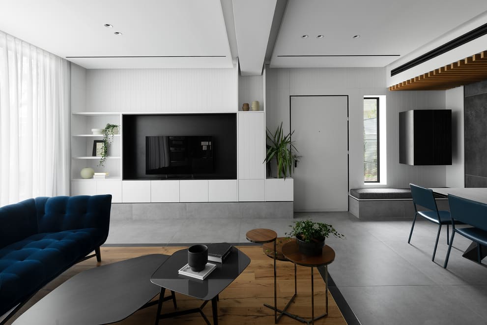 את איזור ההסבה בחלל המגורים תחמנו ובגדרנו בעזרת ריצוף שונה והפרדות בעזרת סרגלי פליז, כך שיש את ריצוף הבית הכללי, בורדר שחור העשוי מאבן בזלת וריצפת עץ אלון מפנקת במיוחד. עוד פרט ריצוף שהיינו רוצים להזכיר הינו הפנל העולה במעלה הקיר 30 ס"מ, העשוי באותו החומר של הריצפה והינו שקוע בקו הקיר ומפורד בעזרת פרופיל אלומיניום מנתק בגוון שחור, כך ניתן להגן על הקירות מפגיעה והן כתוספת אסתטית, לא שגרתית שמאוד נהנו לתכנן עבור הלקוח.