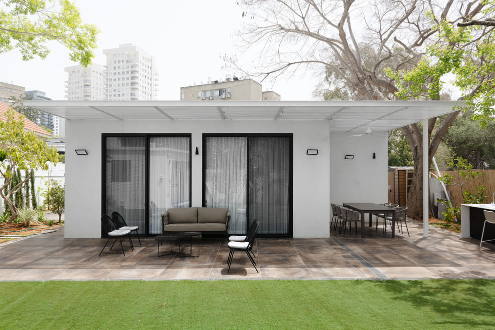 את חצר הבית שיפצנו באופן מלא, עם ריצוף מיוחד המתכתב עם סגנון הפנים בגאומטריה, בחומרים ובגוונים. הוספנו פרגולת פלדה רפפה בגוון לבן כגוון הבית ועמוד מרכזי הבולט בכניסה לבית נצבע בשחור בכדי להבליט שוב את הקונסטרוקציה, אך הפעם מהצד החיצוני.